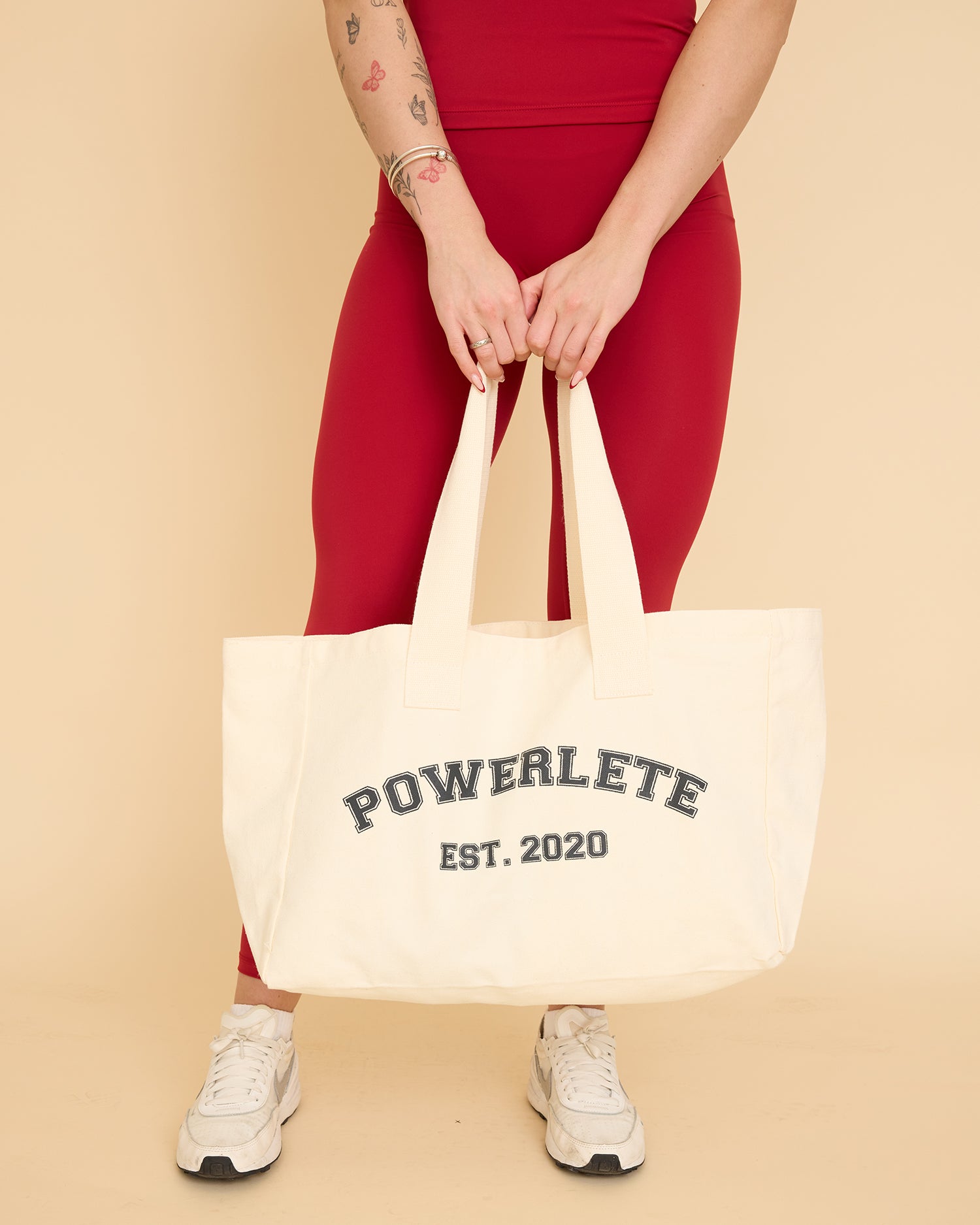 Möt Powerlete Varsity Tote - ditt nya vardagsnödvändiga plagg. I en neutral beige färg med en djärv svart Varsity-logotyp är den här väskan den perfekta blandningen av stil och funktion. Oavsett om du går på gymmet, gör ärenden eller går ut, är den byggd för att hålla jämna steg med din hektiska livsstil. Den är praktisk, slitstark och cool utan ansträngning och är din go-to väska för vad som än händer under dagen.